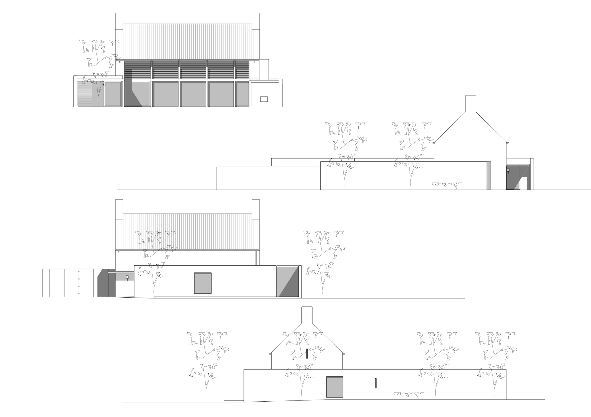 On the other side of the house, the garden façade is completely transparent thanks to the extensive use of glass elements at the ground level and halfway to the second floor. As far as its appearance is concerned, Villa Rotonda impresses with a delicate contrast between its dark gray slate roof tiles and medium gray brick walls.